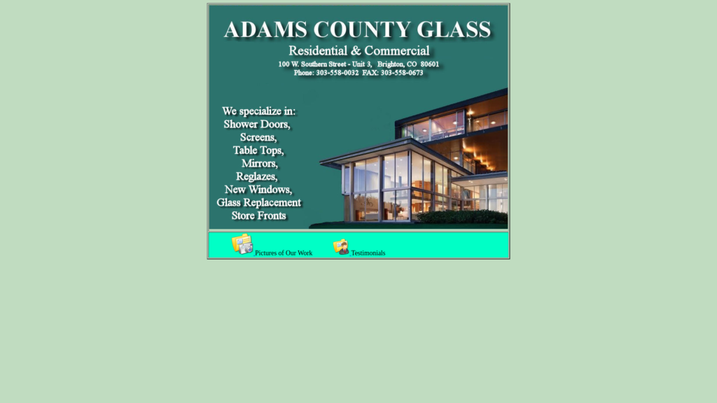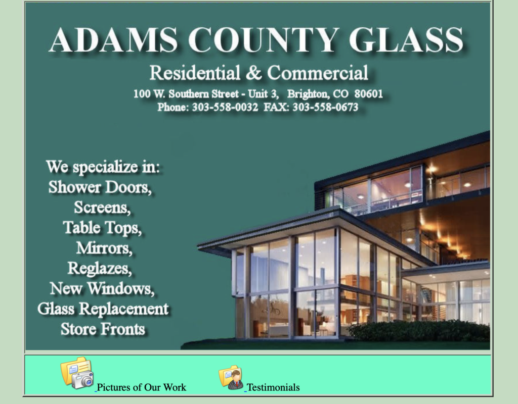 Adams County Glass, 100 W. Southern St. Unit 3, Brighton, CO 80601 (303)558-0032 Specialists in Residential and Commercial New and Replace Glass for Windows, Doors, Store Fronts, Showers, Screens, Table Tops, Reglazes and Mirrors.