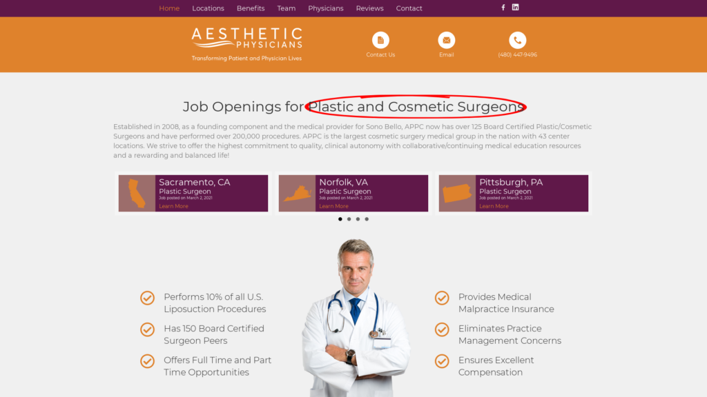 Established in 2008, as a founding component and the medical provider for Sono Bello, APPC now has over 125 Board Certified Plastic/Cosmetic Surgeons and have performed over 200,000 procedures. APPC is the largest cosmetic surgery medical group in the nation with 43 center locations. We strive to offer the highest commitment to quality, clinical autonomy with collaborative/continuing medical education resources and a rewarding and balanced life!