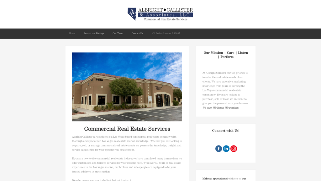 Albright Callister & Associates is a Las Vegas based commercial real estate company with thorough and specialized Las Vegas real estate market knowledge.  Whether you are looking to acquire, sell, or manage commercial real estate assets we possess the knowledge, insight, and service capabilities for your specific real estate needs.