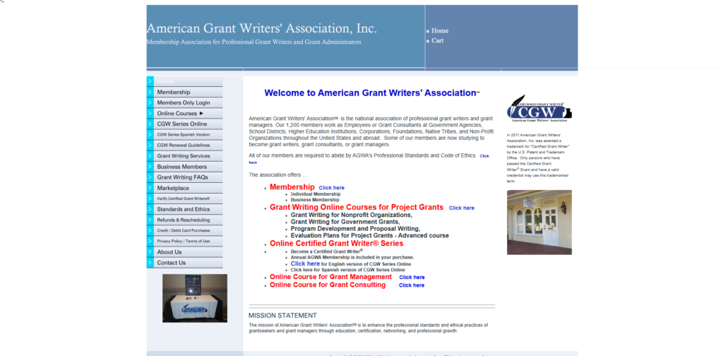 American Grant Writers’ Association, Inc. is a Florida nonprofit corporation and is a 501(c)6 exempt organization. To promote professional conduct of our 1,200 active members, the organization adopted Standards of Practice and Professional Ethics. To further the professional growth of its members, the organization awards the Certified Grant Writer® Credential to members who have demonstrated proficiency in grantseeking. In 2011 the U.S. Patent Office awarded American Grant Writers’ Association a Trademark for its Certified Grant Writer® Credential.