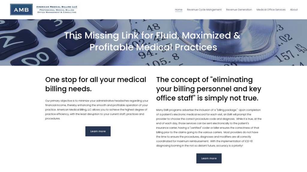 American Medical Billing, LLC is a well-established billing and consulting service for medical practices. American Medical Billing, LLC is staffed with more than 30 years of combined professional and administrative experience. This experience includes office practice management, billing, and account receivable administration, as well as practice analysis.