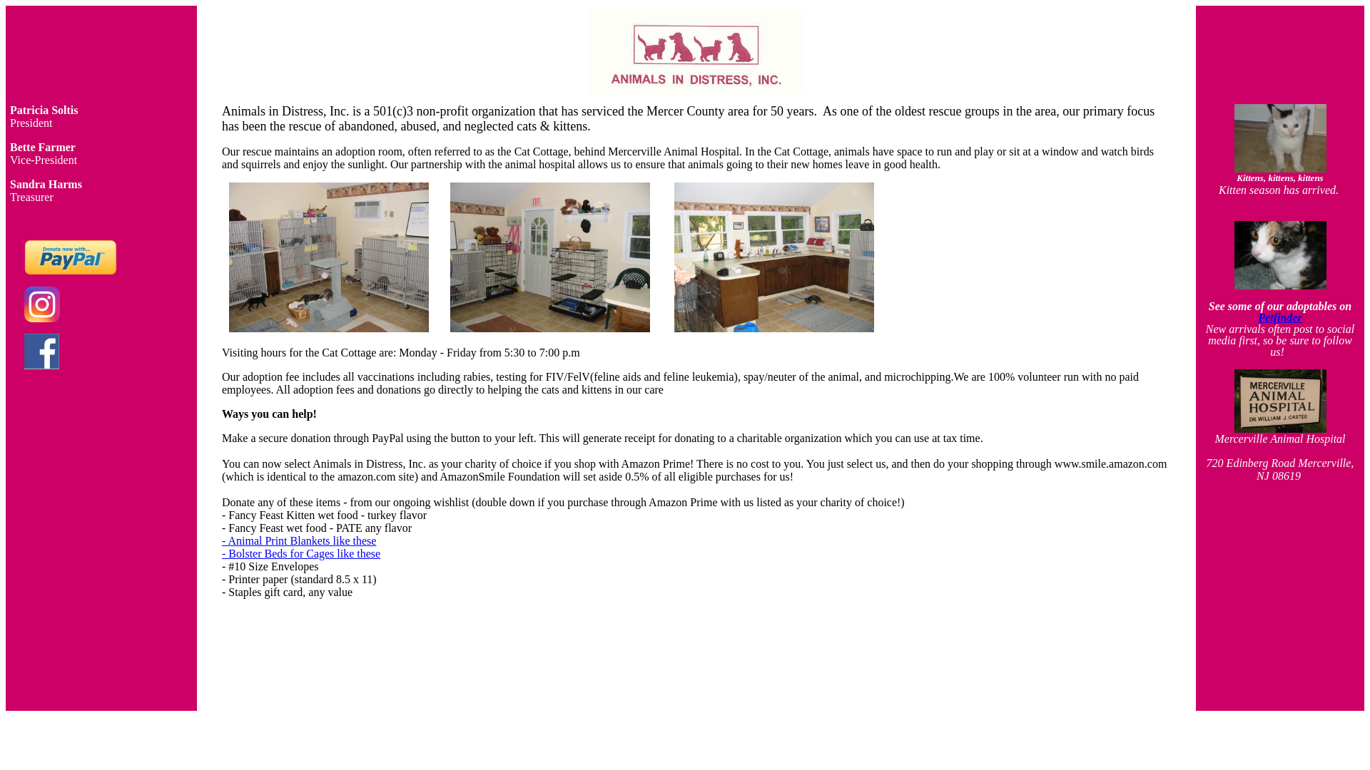Animals in Distress, Inc. is a 501(c)3 non-profit organization that has serviced the Mercer County area for 50 years. As one of the oldest rescue groups in the area, our primary focus has been the rescue of abandoned, abused, and neglected cats & kittens.