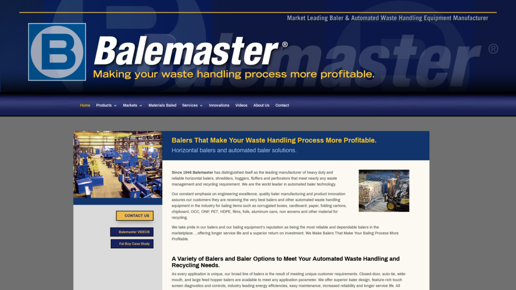 Since 1946 Balemaster has distinguished itself as the leading manufacturer of heavy duty and reliable horizontal balers, shredders, hoggers, fluffers and perforators that meet nearly any waste management and recycling requirement. We are the world leader in automated baler technology.