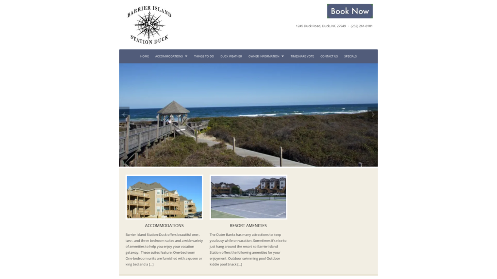 Barrier Island Station is an oceanfront resort in Duck, a charming small town in the northern section of the Outer Banks. The resort offers a choice of one-, two- and three-bedroom suites with a variety of amenities and will accommodate from one to ten guests depending on size. The resort itself offers many things to do including swimming, tennis, working out, special activities, direct beach access and more to keep you busy.