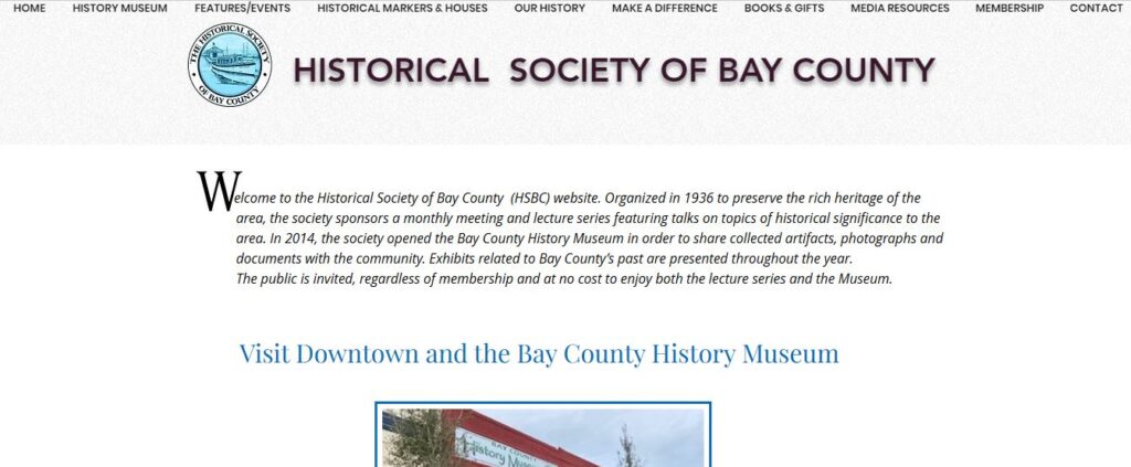 Organized in 1936 to preserve the rich heritage of the area, the society sponsors a monthly meeting and lecture series featuring talks on topics of historical significance to the area. In 2014, the society opened the Bay County History Museum in order to share collected artifacts, photographs and documents with the community. Exhibits related to Bay County’s past are presented throughout the year.