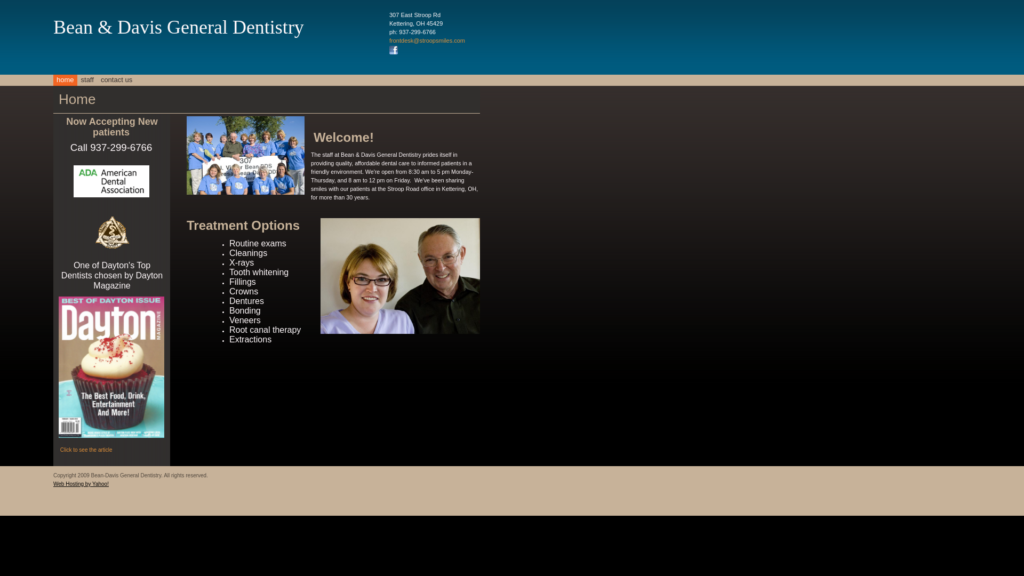 The staff at Bean & Davis General Dentistry prides itself in providing quality, affordable dental care to informed patients in a friendly environment. We’re open from 8:30 am to 5 pm Monday-Thursday, and 8 am to 12 pm on Friday. We’ve been sharing smiles with our patients at the Stroop Road office in Kettering, OH, for more than 30 years.