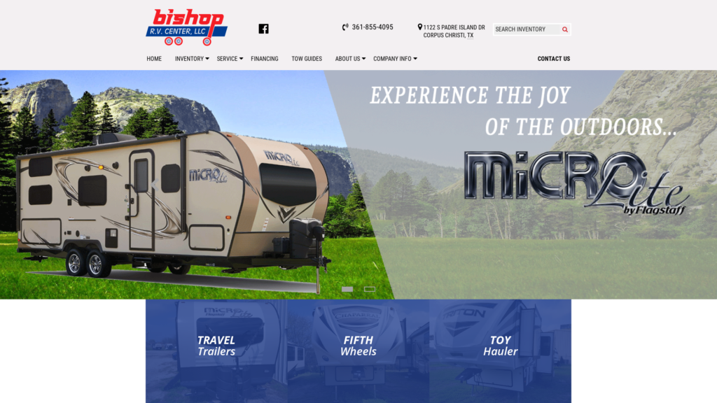 Bishop RV Center, LLC is an RV Dealer Located in Corpus Christi, TX Near San Diego, Riviera, Mathis, and Rockport. We sell new and pre-owned Travel Trailers, Fifth Wheels, and Toy Haulers, with excellent financing and pricing options
