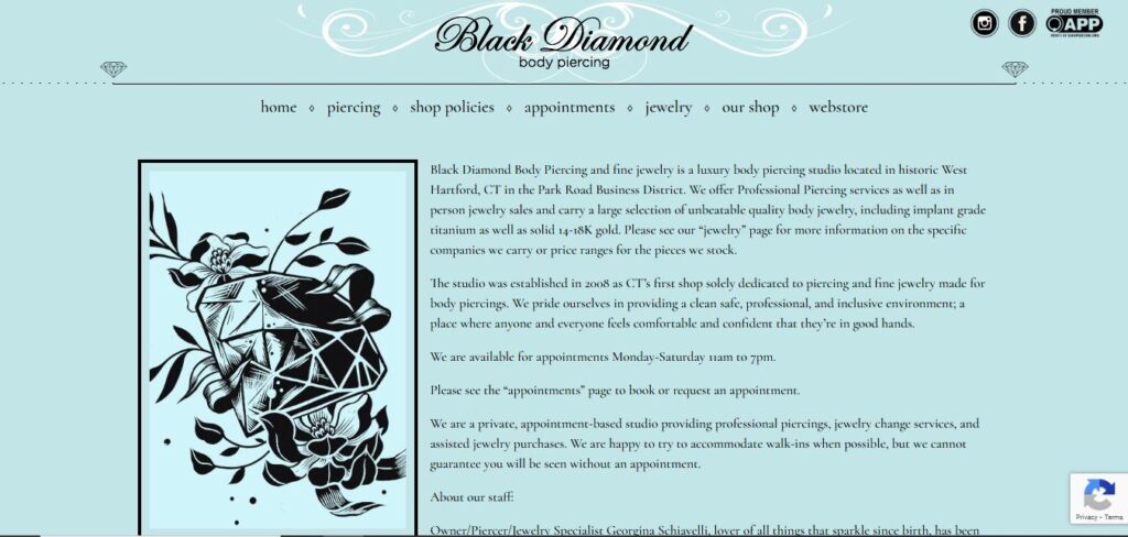 Black Diamond Body Piercing and fine jewelry is a luxury body piercing studio located in historic West Hartford, CT in the Park Road Business District. We offer Professional Piercing services as well as in person jewelry sales and carry a large selection of unbeatable quality body jewelry, including implant grade titanium as well as solid 14-18K gold. Please see our “jewelry” page for more information on the specific companies we carry or price ranges for the pieces we stock.