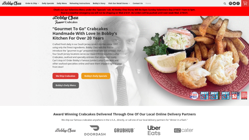Crafted fresh daily in our South Jersey scratch kitchen since 1997 using only the finest ingredients. Bobby Chez was the first to introduce the “gourmet to go” prepared meal to take out the concept. Our four South Jersey locations serve our Award-Winning Jumbo Lump Crabcakes, seafood and specialty entrees that are almost ready. Can’t stop in? Order Bobby’s Famous Jumbo Lump Crabcakes and other seafood specialties online and have them shipped right to your front door!