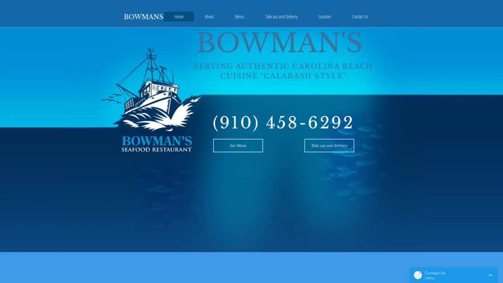 At Bowman’s, you have the option of ordering from a great selection of fried seafood, including shrimp, oysters, flounder, whiting, deviled crab, and clam strips. Bowman also serves succulent crab legs, broiled flounder, and more. For those who are not in the mood for seafood, Bowman offers juicy USDA Choice Hand-Cut Steaks, their famous pulled pork Bar-B-Que and a mouth-watering hamburger steak.