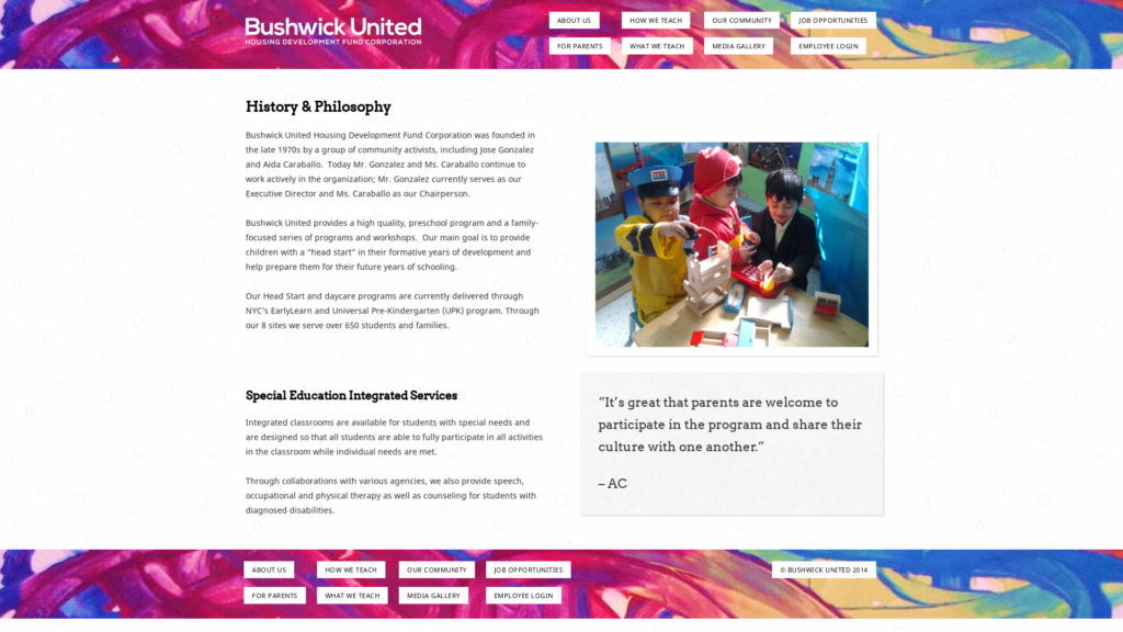 Bushwick United provides a high quality, preschool program and a family-focused series of programs and workshops. Our main goal is to provide children with a “head start” in their formative years of development and help prepare them for their future years of schooling.