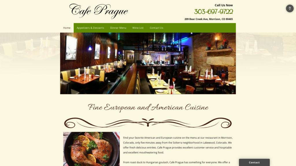 Café Prague, located in Morrison, Colorado, offers the best European and American cuisine in town. Call us at (303) 697-9722 to make a reservation, today.