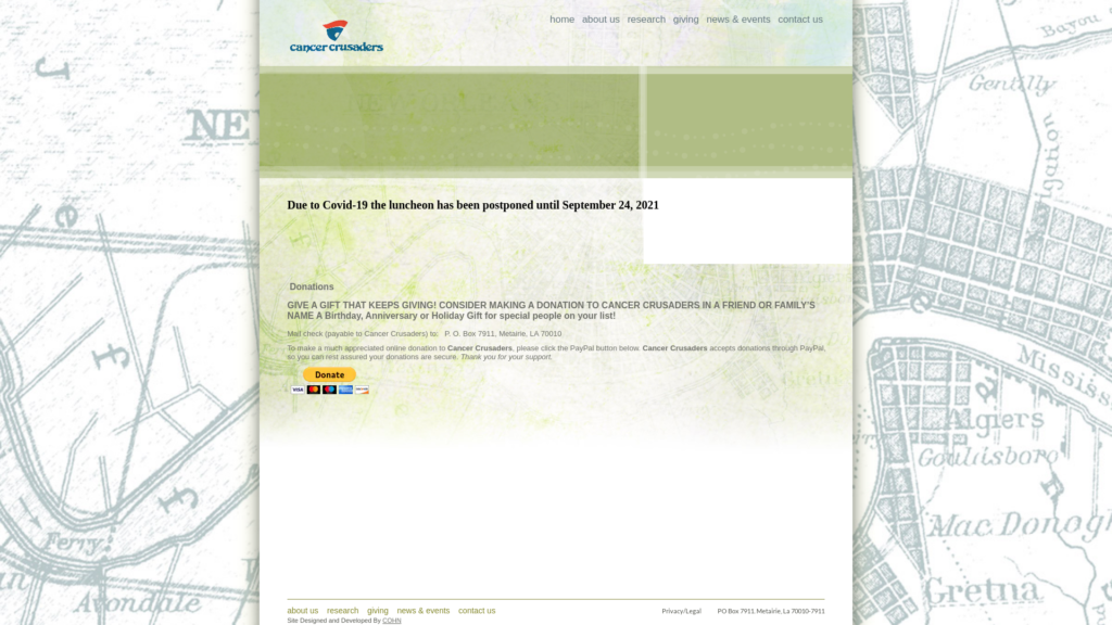 Cancer Crusaders was founded in 1976 and incorporated in 1978 for the purpose of raising funds for cancer research in the New Orleans area. Cancer Crusaders, Inc. is a non-profit, all-volunteer organization with no administrative overhead, and it is not affiliated with any other cancer fund-raising organization.