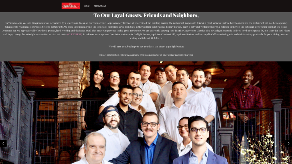 It is with great sadness that we have to announce the restaurant will not be reopening. Cinquecento was many of our most beloved restaurants.