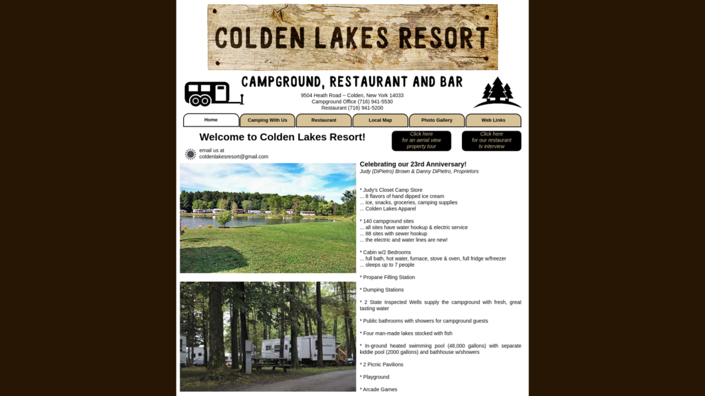 Family Fun and Recreation: Full service restaurant, luxurious campground and camp store. Live music on the weekends, Sunday Bike and Cruise Day with music on the deck, and restaurant lounge open 7 days a week. Come enjoy outdoor dining on our patio overlooking the lakes or choose to enjoy your meal in our up-scaled dining room also situated over the water with a picturesque view wherever you choose to sit. Camp store featuring 8 flavors of hand dipped ice cream, ice, snacks, Colden Lakes Apparel, arcade games for the kids, camping supplies, campfire wood, groceries and more. Our resort has a heated in ground swimming pool and kiddie pool, playground, softball diamond horseshoes, snowmobile trails kinking trails and four lakes to fish. The campground amenities include a laundry facility, propane fill station, water electric and sewer hookups, dumping stations as well as well maintained restrooms and showers.