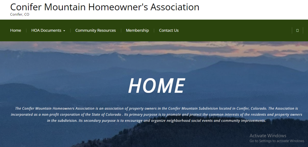The Conifer Mountain Homeowners Association is an association of property owners in the Conifer Mountain Subdivision located in Conifer, Colorado. The Association is incorporated as a non-profit corporation of the State of Colorado . Its primary purpose is to promote and protect the common interests of the residents and property owners in the subdivision. Its secondary purpose is to encourage and organize neighborhood social events and community improvements.