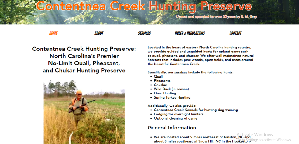 Located in the heart of eastern North Carolina hunting country, we provide guided and unguided hunts for upland game such as quail, pheasant, and chuckar. We offer well maintained natural habitats that includes pine woods, open fields, and areas around the beautiful Contentnea Creek.
