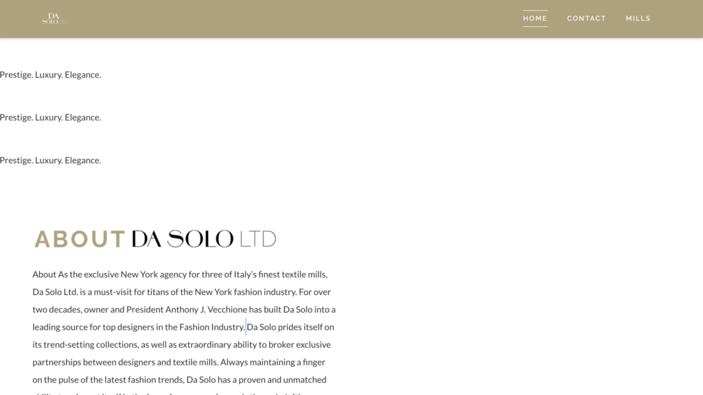 As the exclusive New York agency for three of Italy’s finest textile mills, Da Solo Ltd. is a must-visit for titans of the New York fashion industry. For over two decades, owner and President Anthony J. Vecchione has built Da Solo into a leading source for top designers in the Fashion Industry. Da Solo prides itself on its trend-setting collections, as well as extraordinary ability to broker exclusive partnerships between designers and textile mills. Always maintaining a finger on the pulse of the latest fashion trends, Da Solo has a proven and unmatched ability to reinvent itself in the face of consumer demands through deftly balancing tradition and technology.