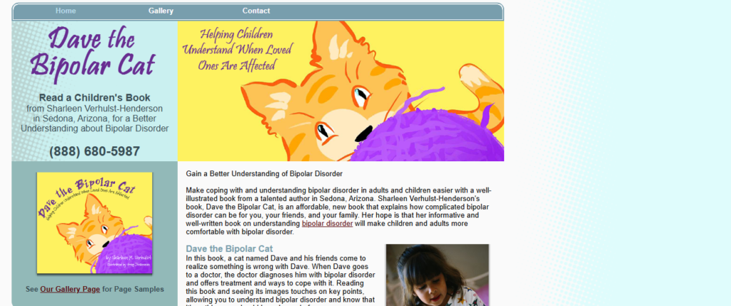 Make coping with and understanding bipolar disorder in adults and children easier with a well-illustrated book from a talented author in Sedona, Arizona. Sharleen Verhulst-Henderson’s book, Dave the Bipolar Cat, is an affordable, new book that explains how complicated bipolar disorder can be for you, your friends, and your family. Her hope is that her informative and well-written book on understanding bipolar disorder will make children and adults more comfortable with bipolar disorder.