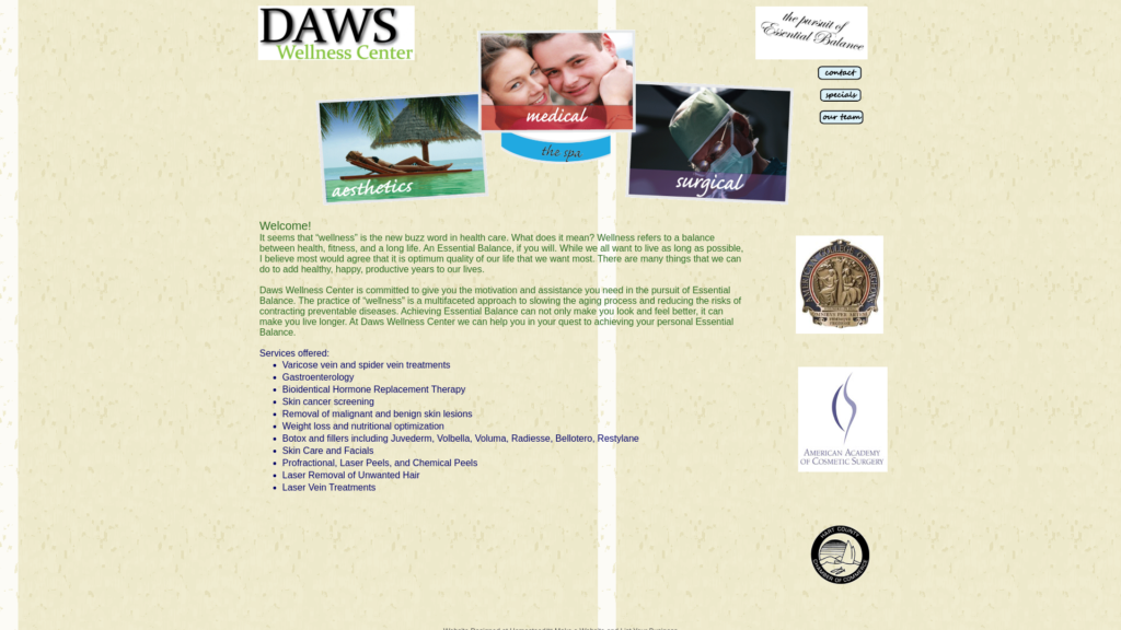 Daws Wellness Center is committed to giving you the motivation and assistance you need in the pursuit of Essential Balance. The practice of “wellness” is a multifaceted approach to slowing the aging process and reducing the risks of contracting preventable diseases. Achieving Essential Balance can not only make you look and feel better, but it can also make you live longer. At Daws Wellness Center we can help you in your quest to achieving your personal Essential Balance.