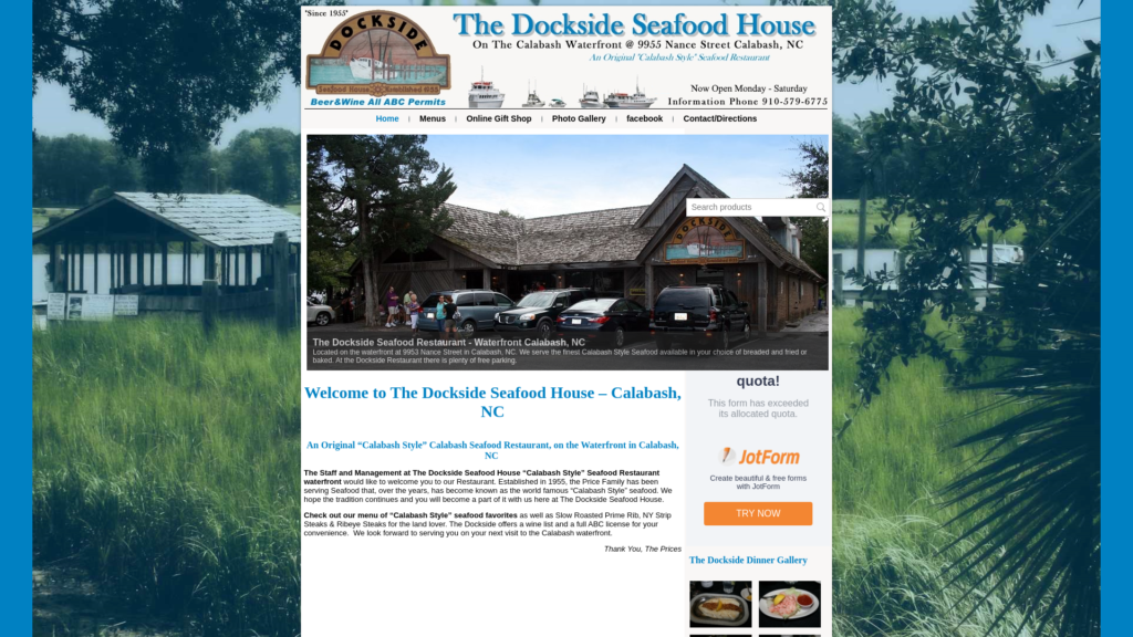 The Staff and Management at The Dockside Seafood House “Calabash Style” Seafood Restaurant waterfront would like to welcome you to our Restaurant. Established in 1955, the Price Family has been serving Seafood that, over the years, has become known as the world-famous “Calabash Style” seafood. We hope the tradition continues and you will become a part of it with us here at The Dockside Seafood House.