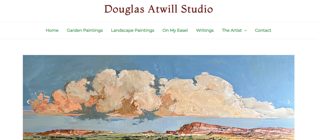 Douglas Atwill paints in acrylics, usually on the primed linen canvas he prefers. His subjects range from the New Mexico landscape of mesas, escarpments and mountain scenes to verdant corners of his own garden. His original paintings sell for prices ranging from a few hundred dollars for a small canvas to ten thousand dollars for his largest size, sixty-six inches square. Atwill’s work is included in personal collections, as well as on corporate and museum walls across the country. He welcomes calls on his studio phone: 505-983-2852.