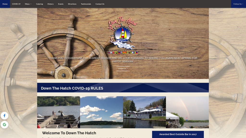 Down the Hatch is famous for its outdoor lakeside dining area, great food and good times. We also have a formal dining room that is open part of the season which is available for parties and corporate functions. Down The Hatch is open on Tuesday through Sunday from 11:30am – 9pm. Our season begins in May and ends in September.