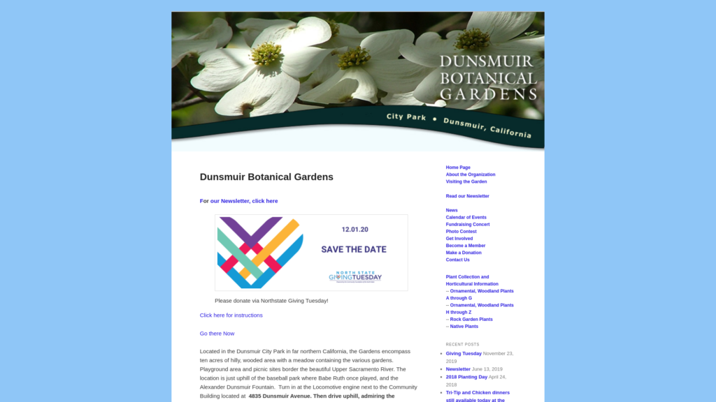 The purpose of the Dunsmuir Botanical Gardens is to enhance the natural setting of the Dunsmuir City Park for the enjoyment and horticultural education of the public through the establishment and maintenance of native and woodland plants. Through its fundraising efforts, the Dunsmuir Botanical Gardens Board of Directors works with other community organizations and local schools to increase civic pride and the beautification of the City of Dunsmuir.