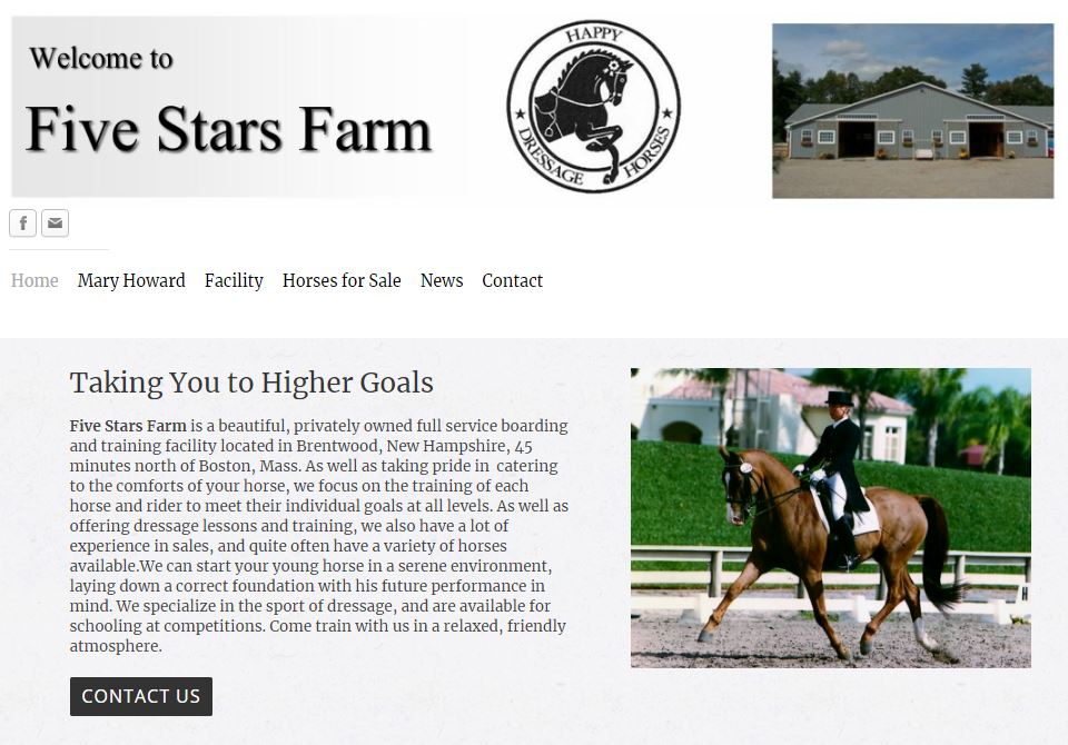 Five Stars Farm is a beautiful, privately-owned full-service boarding and training facility located in Brentwood, New Hampshire, 45 minutes north of Boston, Mass. As well as taking pride in catering to the comforts of your horse, we focus on the training of each horse and rider to meet their individual goals at all levels. As well as offering dressage lessons and training, we also have a lot of experience in sales, and quite often have a variety of horses available. We can start your young horse in a serene environment, laying down a correct foundation with his future performance in mind. We specialize in the sport of dressage and are available for schooling at competitions. Come train with us in a relaxed, friendly atmosphere.
