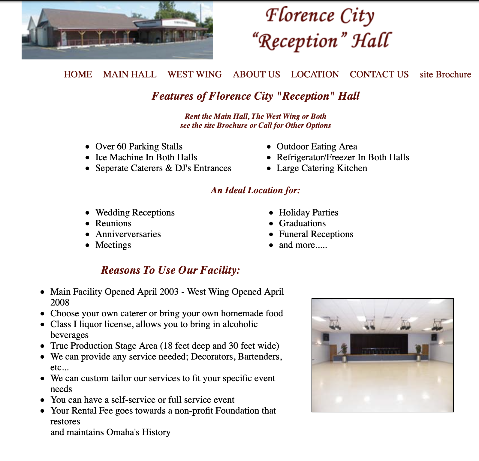 The Florence Historical Foundation continues to restore and maintain, The 1888 Florence Depot Museum, The 1856 Florence Bank Museum, The 1905 Keirle House, The Mormon Bridge Toll House and The 1888 Florence Fire Barn. The Florence City “Reception” Hall is the original site of Florence’s City Hall, Jail and Fire Station back in the 1880’s. The Florentine Players continue to be a part of the fundraising arm of the Florence Historical Foundation by performing several times during the year. The facility was built by your donations and is truly a “community building”. The Hall was built by this community for everyone’s benefit and usage. We take pride in what we’ve built and hope you do too when using the Florence City “Reception” Halls.