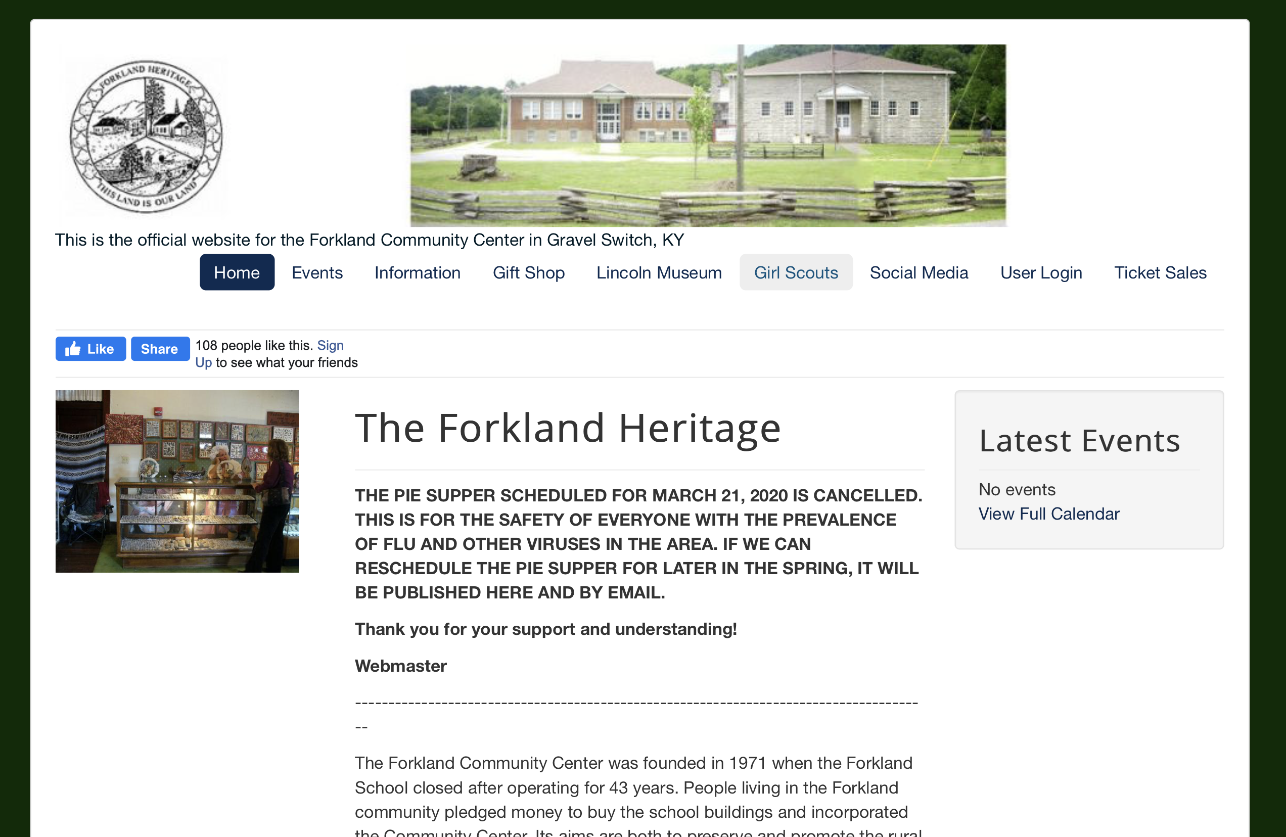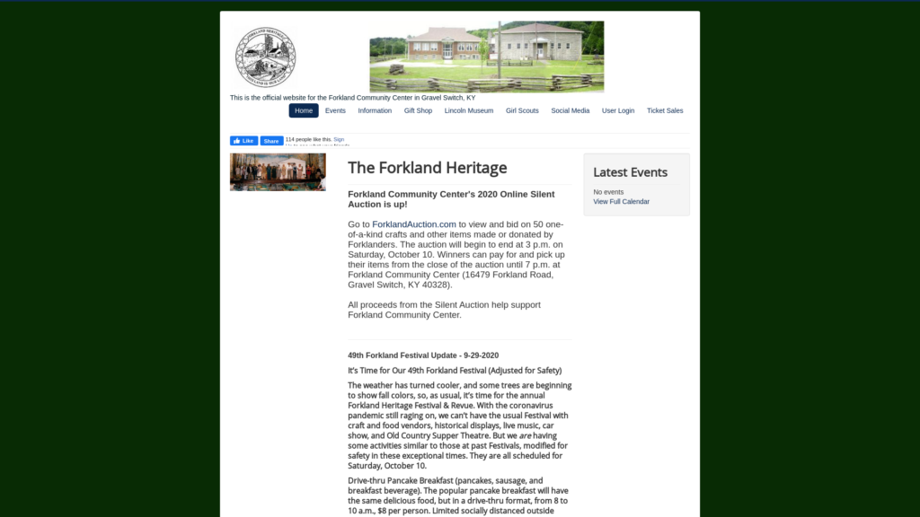 We have several special events open to the public during the year, including our Forkland Heritage Festival & Revue each October, one of the few true folk festivals in Kentucky. Other annual events include a Pie Supper in March, a High Tea in May, the Halloween Carnival, an elegant Christmas Dinner, and Twilight Christmas. The Forkland Lincoln Museum and Gift Shop are open regularly throughout the year. Forkland is well-known for its artists, and their works are displayed throughout the Community Center buildings. Additional activities include weekly art classes, Cub Scout and Boy Scout meetings, basketball, family reunions, picnics, and volunteer workdays.
