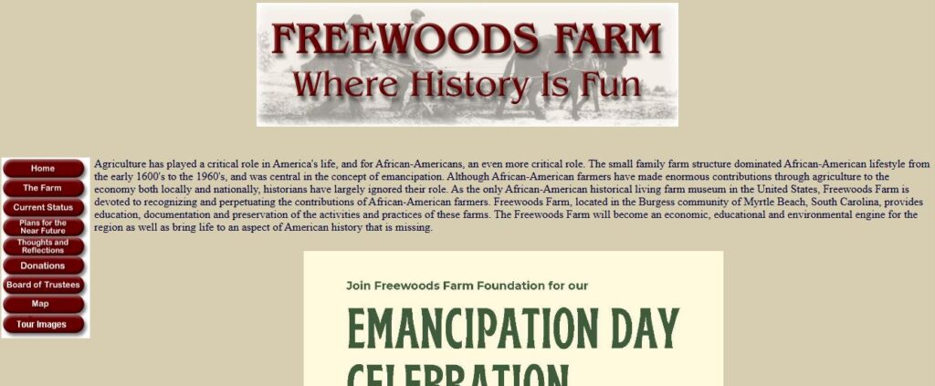Agriculture has played a critical role in America’s life, and for African-Americans, an even more critical role. The small family farm structure dominated African-American lifestyle from the early 1600’s to the 1960’s, and was central in the concept of emancipation. Although African-American farmers have made enormous contributions through agriculture to the economy both locally and nationally, historians have largely ignored their role. As the only African-American historical living farm museum in the United States, Freewoods Farm is devoted to recognizing and perpetuating the contributions of African-American farmers. Freewoods Farm, located in the Burgess community of Myrtle Beach, South Carolina, provides education, documentation and preservation of the activities and practices of these farms. The Freewoods Farm will become an economic, educational and environmental engine for the region as well as bring life to an aspect of American history that is missing.