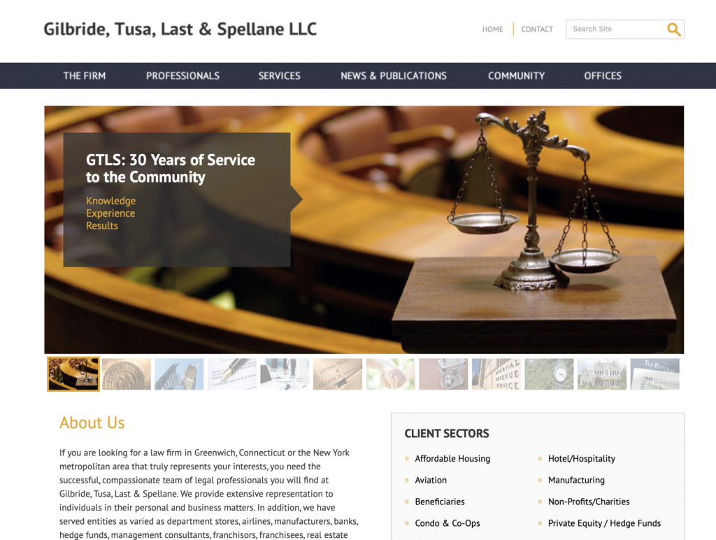 If you are looking for a law firm in Greenwich, Connecticut or the New York metropolitan area that truly represents your interests, you need the successful, compassionate team of legal professionals you will find at Gilbride, Tusa, Last & Spellane. We provide extensive representation to individuals in their personal and business matters. In addition, we have served entities as varied as department stores, airlines, manufacturers, banks, hedge funds, management consultants, franchisors, franchisees, real estate developers, closely-held corporations, partnerships, limited partnerships, trade associations and entrepreneurs.
