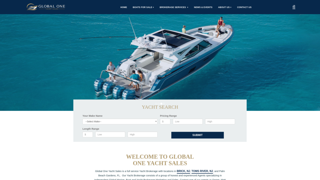 Global One Yacht Sales is a full-service Yacht Brokerage with locations in Brick, NJ, Toms River, NJ, and Palm Beach Gardens, FL. Our Yacht Brokerage consists of a group of honest and experienced Agents specializing in Independent Global Marine, Boat, and Yacht Brokerage Marketing and Sales. Contact one of our agents or Owner, Matt Begovich, and you will be able to experience a true difference in how we approach things.