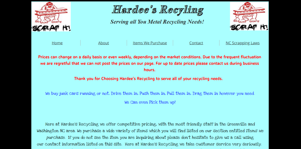 Here at Hardee’s Recycling we offer competitive pricing, with the most friendly staff in the Greenville and Washington NC area. We purchase a wide variety of items which you will find listed on our section entitled Items we purchase. If you do not see the item you are inquiring about please don’t hesitate to give us a call using our contact information listed on this site. Here at Hardee’s Recycling we take customer service very seriously. We value our customers and their families. We offer numerous customer appreciation days throughout the year. We are always looking for ways to improve our business. If you have any complaints or suggestions about how we could do things better, please don’t hesitate to communicate this to us, using the form located under the contact us tab.