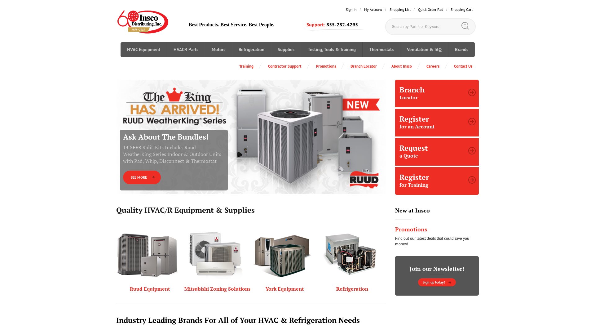 Insco is an award-winning Ruud distributor, stocking a full line of residential and commercial equipment. Other major Insco product lines include York residential and commercial equipment, Mitsubishi Electric VRF zoning systems, Tecumseh refrigeration products and Comfort-Aire window air conditioners, window heat pumps, packaged terminal A/C & Heat pumps (PTAC), portable cooling & heating, and dehumidifiers.