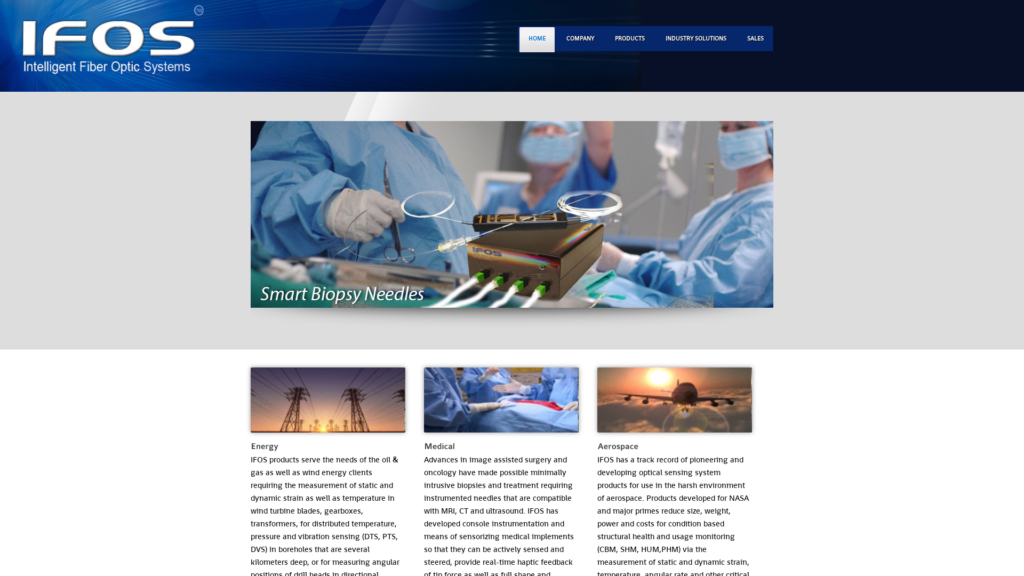 Intelligent Fiber Optic Systems Corporation, IFOS, is a Silicon Valley-based pioneer of advanced photonic and optoelectronic sensing products and solutions using fiber optics for the measurement and analysis of physical, chemical, and biological parameters. Pressures to 1 kBar, temperatures to 1000°C, angular rates, strains as small as sub-micro-strain and as large as 10,000 micro-strain, vibrations, magnetic fields, and a number of other parameters can be measured accurately at sampling rates in the kS/s to MS/s range simultaneously across large numbers of sensors in various operating environments and applications.