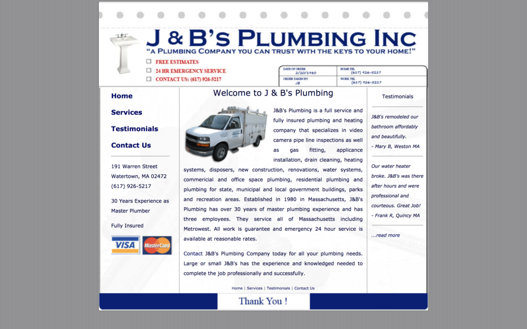 J&B’s Plumbing is a full service and fully insured plumbing and heating company that specializes in video camera pipeline inspections as well as gas fitting, appliance installation, drain cleaning, heating systems, disposers, new construction, renovations, water systems, commercial and office space plumbing, residential plumbing and plumbing for state, municipal and local government buildings, parks and recreation areas. Established in 1980 in Massachusetts, J&B’s Plumbing has over 30 years of master plumbing experience and has three employees. They service all of Massachusetts including Metrowest. All work is guarantee and emergency 24-hour service is available at reasonable rates.