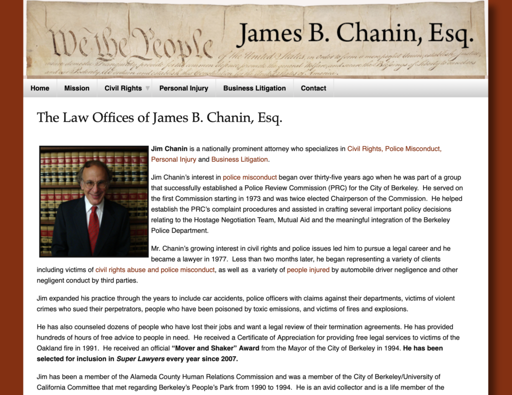 Jim Chanin’s interest in police misconduct began over thirty-five years ago when he was part of a group that successfully established a Police Review Commission (PRC) for the City of Berkeley.  He served on the first Commission starting in 1973 and was twice elected Chairperson of the Commission.  He helped establish the PRC’s complaint procedures and assisted in crafting several important policy decisions relating to the Hostage Negotiation Team, Mutual Aid and the meaningful integration of the Berkeley Police Department.