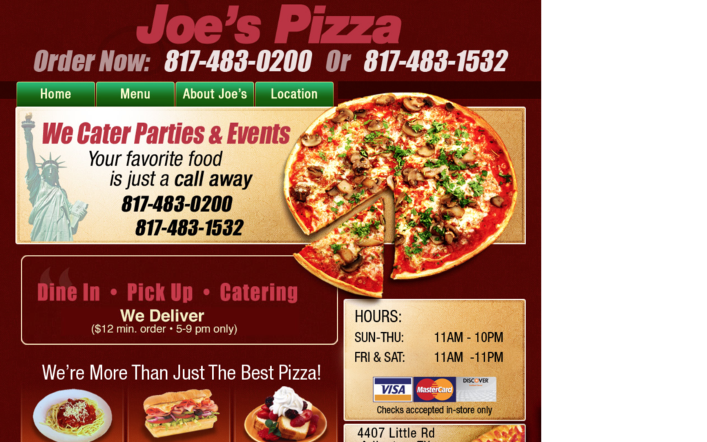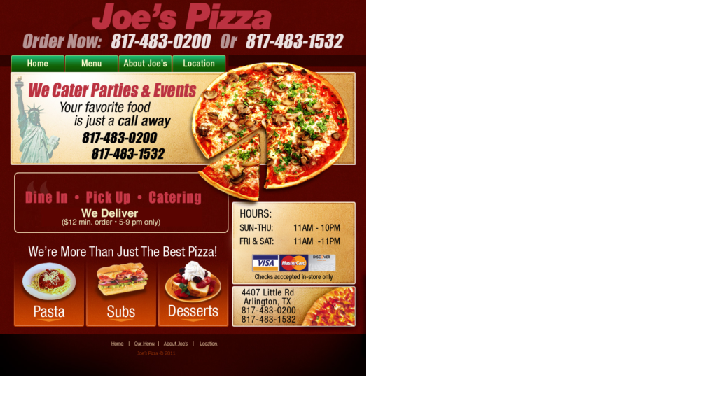 Joe’s owner and family have been serving authentic Sicilian Style pizza and pasta to the South Arlington/Kennedale area for over 15 years.