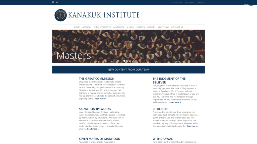 The Kanakuk Institute was founded in 2002 to provide a place for young men and women to intensively study the Word of God and experience life-change through biblical community and the power of the gospel. The Institute provides the applicable essentials of seminary in a way that prepares students to live a Christ-exalting life in any occupation. Over 900 Alumni have entered the business world, medical field, local ministries, and world missions. Offering MBA and M.Div transfer credit, the Institute is a great way to prepare for your future both spiritually and professionally. Watch the video below for more information on the Institute’s vision and history.