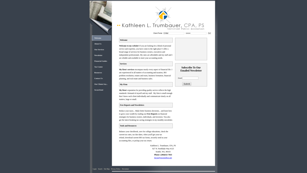 Take a look at our Welcome page. Kathleen L. Trumbauer, CPA, PS is a full Accounting firm located in Seattle, WA.