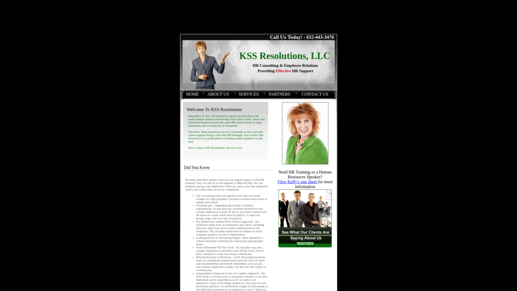 KSS Resolutions strategically partners with both small and mid-sized businesses to help them attain their business goals and objectives through effective interrelations of their biggest resource – human capital. This is accomplished through the direct delivery of HR services to resolve employee relations issues and strengthen the understanding of expectations of the clients� management team through effective communication, training and coaching.