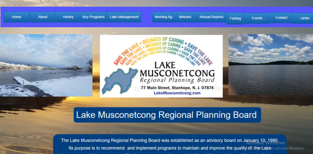 The Lake Musconetcong Regional Planning Board was established as an advisory board on January 10, 1990. Its purpose is to recommend and implement programs to maintain and improve the quality of the Lake Musconetcong Watershed areas. The board reports to the municipalities of Byram, Netcong, Roxbury, Stanhope and the Counties of Sussex, Morris as well as the State of New Jersey. It consists of members from each town and the state. Meetings are held monthly. Visitors are most welcome.