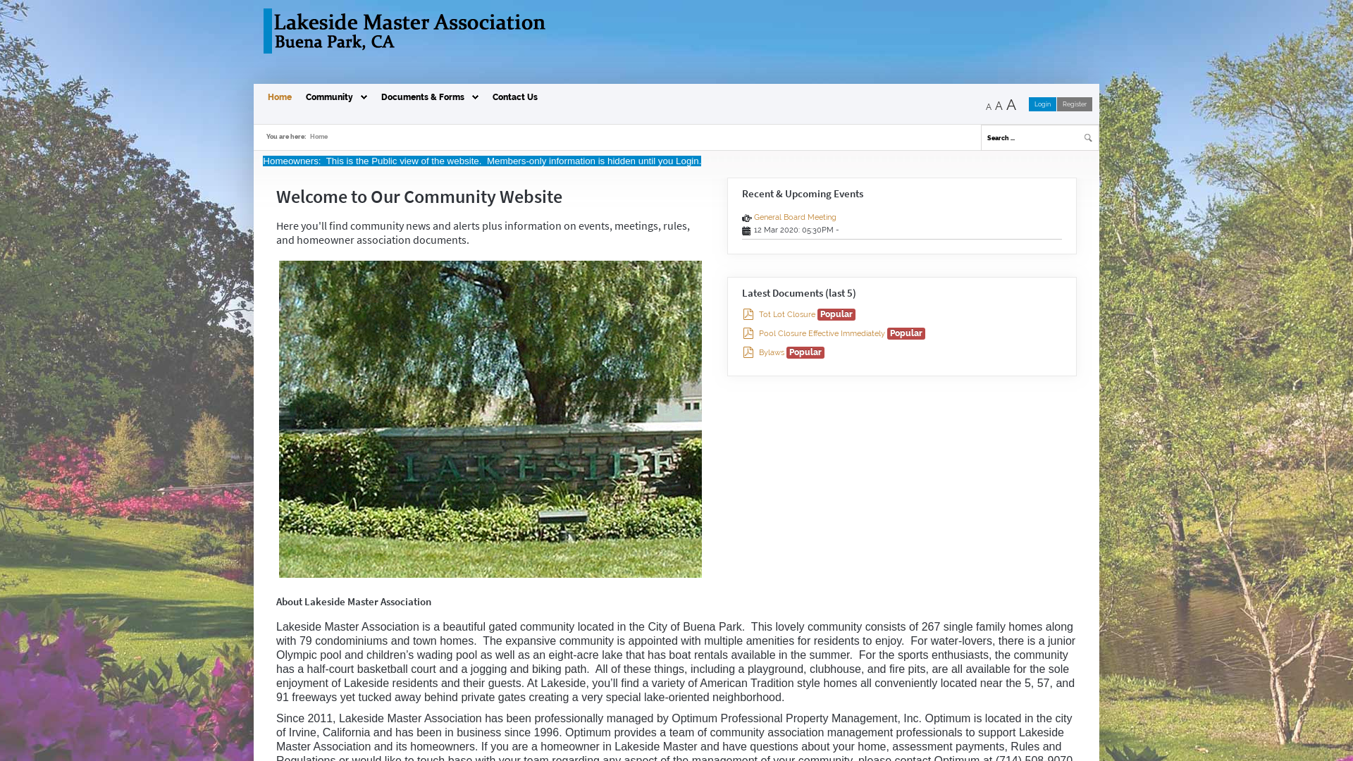 Since 2011, Lakeside Master Association has been professionally managed by Optimum Professional Property Management, Inc. Optimum is located in the city of Irvine, California and has been in business since 1996. Optimum provides a team of community association management professionals to support Lakeside Master Association and its homeowners. If you are a homeowner in Lakeside Master and have questions about your home, assessment payments, Rules and Regulations or would like to touch base with your team regarding any aspect of the management of your community, please contact Optimum at (714) 508-9070 or visit the website at www.optimumpm.com. Optimum’s website provides on-line account management options, including payments, as well as the ability to submit service requests, report violations, and express interest in participating in your community! With Optimum’s website, you can take care of your concerns 24 hours a day.
