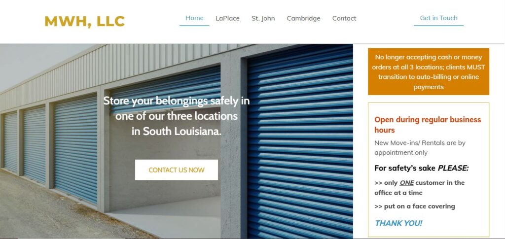 MWH, LLC is a locally owned and operated self-storage company that offers public storage solutions for Louisiana residents. We have three locations including LaPlace Self Storage, St. John Mini Storage, and Cambridge Mini Storage to meet your storage needs, and we offer the lowest prices in town.