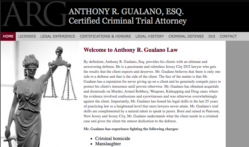 By definition, Anthony R. Gualano, Esq. provides his clients with an ultimate and unwavering defense. He is a passionate and relentless Jersey City DUI lawyer who gets the results that the client expects and deserves. Mr. Gualano believes that there is only one side to defense and that is the side of the client. The fact of the matter is that Mr. Gualano has a reputation for never giving up on a client and he genuinely compels jurys to protect his client’s innocence until proven otherwise. Mr. Gualano has obtained acquittals and dismissals on Murder, Armed Robbery, Weapons, Kidnapping, and Drug cases where the evidence involved confessions and eyewitnesses and was otherwise overwhelmingly against the client. Importantly, Mr. Gualano has honed his legal skills in the last 25 years of practicing law to a heightened level that most lawyers never attain. Mr. Gualano’s trial skills are complemented by a natural talent to speak to jurors. Born and raised in Paterson, New Jersey, and Jersey City, Mr. Gualano understands what the client needs in a criminal case and gives the client the utmost dedication to the defense.