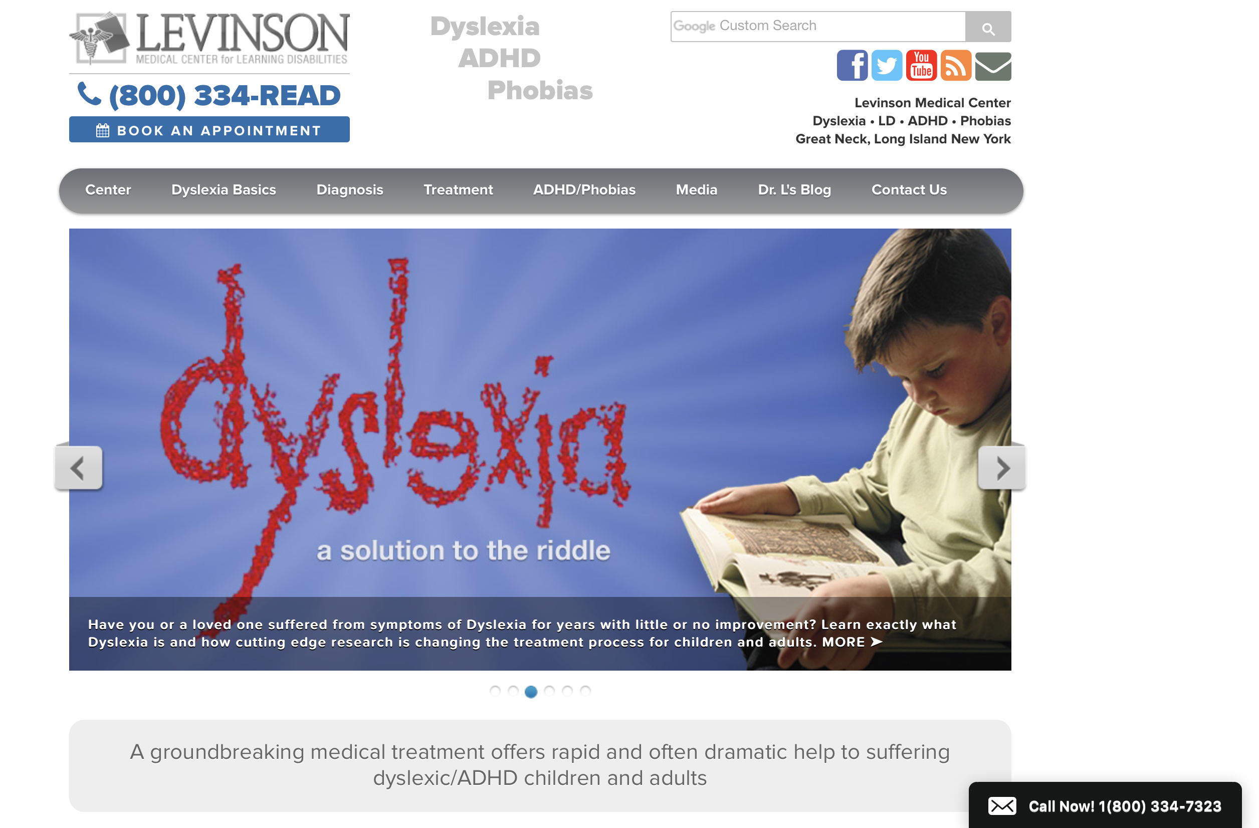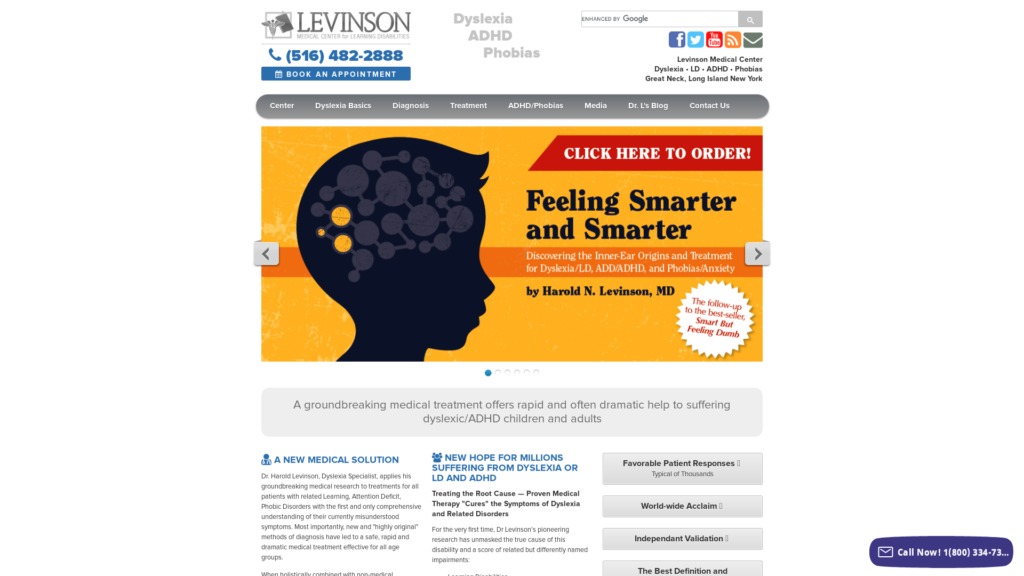 The Levinson Medical Center for Learning Disabilities™ was founded over 35 years ago in order to medically diagnose and treat the inner-ear (cerebellar-vestibular) disorder discovered responsible for causing the many and varied symptoms characterizing Dyslexia or Learning Disabilities (LD) as well as related Attention Deficit Disorder (ADD) and Phobias. To date, Dr. Levinson has diagnosed and treated over 35,000 children and adults with the above and related disorders. And his resulting insights have been documented in seven books and numerous scientific research papers.