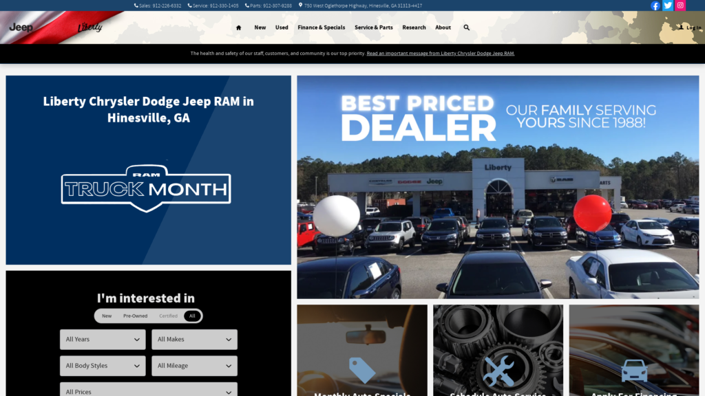 Shop for new & used cars, trucks, SUVs, auto service, repair, and parts at Liberty Chrysler Dodge Jeep Ram in Hinesville. View our inventory online today to get started!