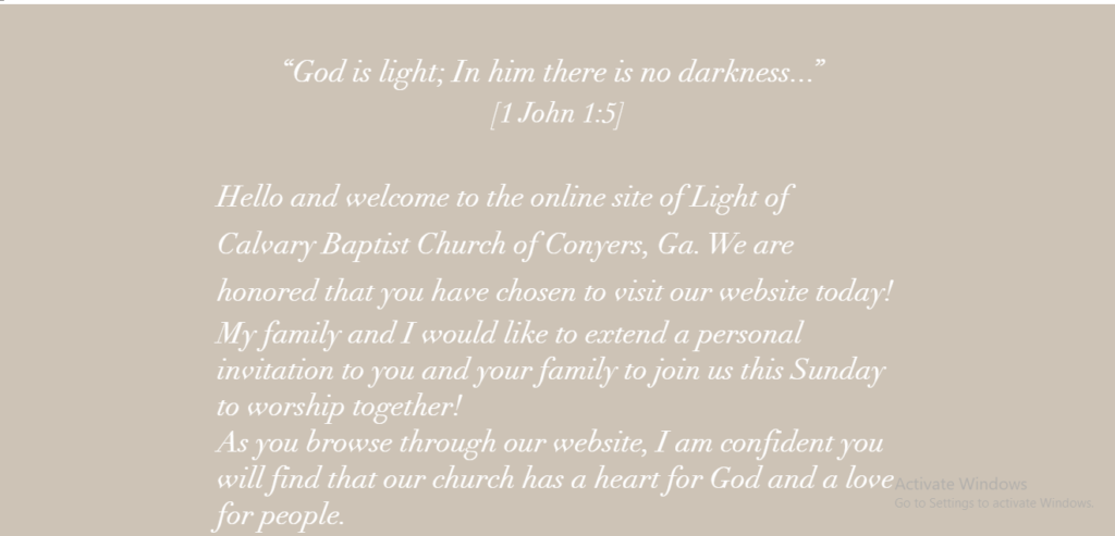 Light of Calvary is an Independent Fundamental Missionary Baptist Church that loves people. We are a very friendly and family oriented church. Many that have visited with us usually end up joining just because of the liberty they feel and the Spirit of the Lord that is very prevalent in our church. We have one of the best pastors (Bro. Eric Lee) and some of the best church members that love to love. You will not be able to walk into Light of Calvary and then walk away feeling ignored, unnoticed, or unloved. We strive to do what our Lord and Savior saved us to do and that is love one another, restore one another, pray for one another and tell EVERYONE how to get to Him.